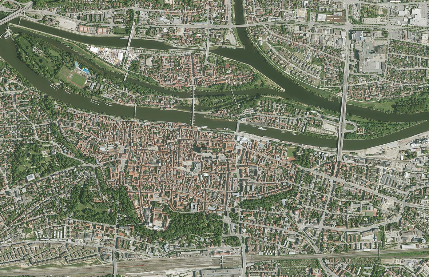 Digitales Orthophoto von Nürnberg aus dem Jahr 2023. Die Basteien an der Burg (im Norden) wurden zwischen 1538 und 45 erbaut.